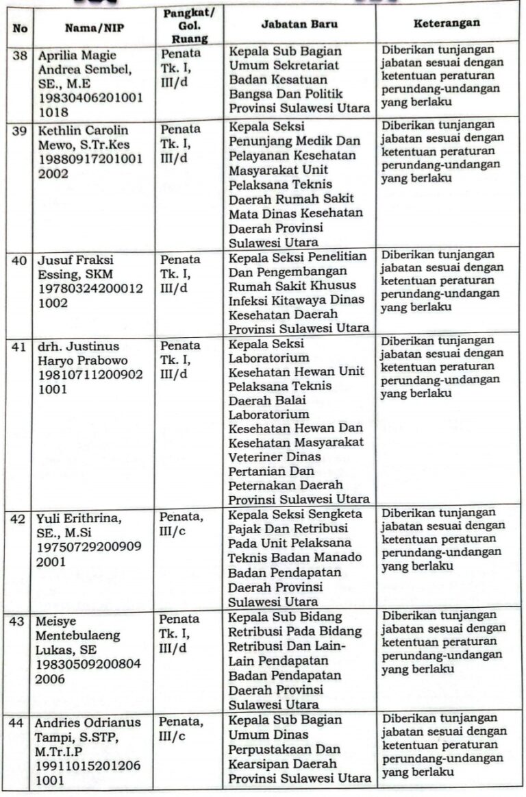 Keputusan Gubernur yang tertuang dalam SK Nomor 800.1.3.3/BKD/SK/4/2026 tentang Pengangkatan Pegawai Negeri Sipil dalam Jabatan Pimpinan Tinggi Pratama di Lingkungan Pemerintah Provinsi Sulawesi Utara, mendasari rekomendasi Badan Kepegawaian Negara (BKN), meliputi hasil uji kompetensi, evaluasi kinerja, serta seleksi terbuka Jabatan Pimpinan Tinggi Pratama di Provinsi Sulawesi Utara.