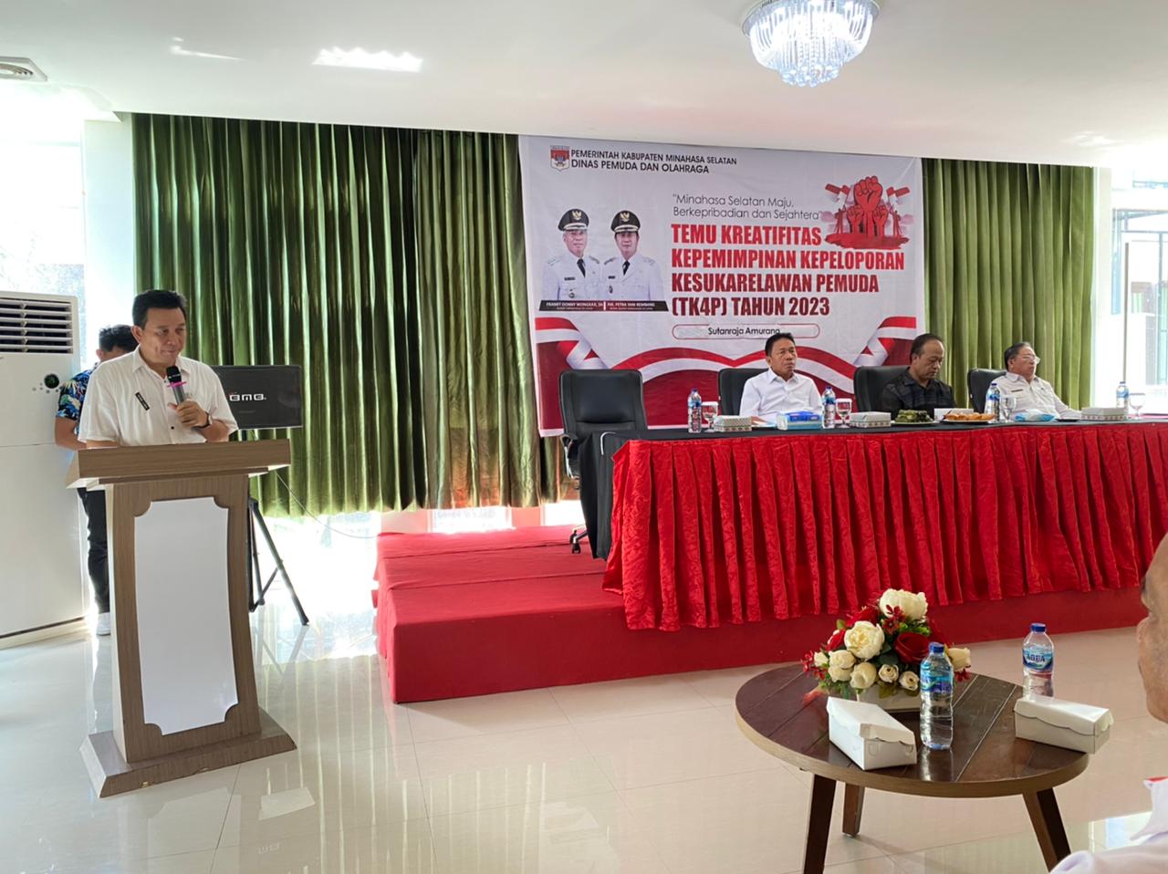 Minsel.Sulut.Teraskata.com-Bupati Kabupaten Minahasa Selatan (Minsel) Franky Donny Wongkar, SH (FDW) mengapresiasi Dinas Pemuda dan Olahraga (Dispora) Minsel saat menggelar kegiatan Temu Kreatifitas Kepemimpinan Kepeloporan Kesukarelawan Pemuda (TK4P) Tahun 2023.