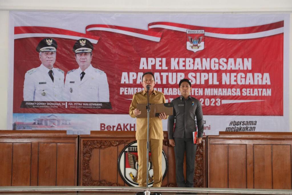 Bupati Minahasa Selatan Franky Donny Wongkar, SH pada Apel Kebangsaan tersebut menyampaikan terkait kedisiplinan para ASN dalam mengikuti Apel yang ada dijajaran Pemerintahan Kabupaten Minahasa Selatan , para ASN kiranya jangan hanya menuntut hak namun kewajiban tidak dilaksanakan dengan sebaik-baiknya. Dan Bupati FDW juga mengingatkan terkait Percepatan Realisasi Fisik, Tertib Inventarisasi Barang dengan Koordinasi Dengan Bidang Aset Bkad Kabupaten Minahasa Selatan, juga terkait Prevalensi Stunting Di Minahasa Selatan.