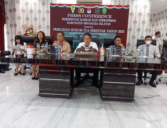 Pelaksanaan Pemilihan Hukum Tua serentak Kabupaten Minahasa Selatan yang rencana bakal digulir pada tahun 2023 ini di Tunda usai pemilihan President dan pileg serta Pilkada Tahun 2023 mendatang, pernyataan ini dijelaskan oleh Bupati Minahasa selatan Franky D.Wongkar SH, (FDW) pada hari ini Rabu 22/02/2023 bertempat di ruang Rapat bupati dalam perss Confrense bersama seanteru Pers Minahasa Selatan.